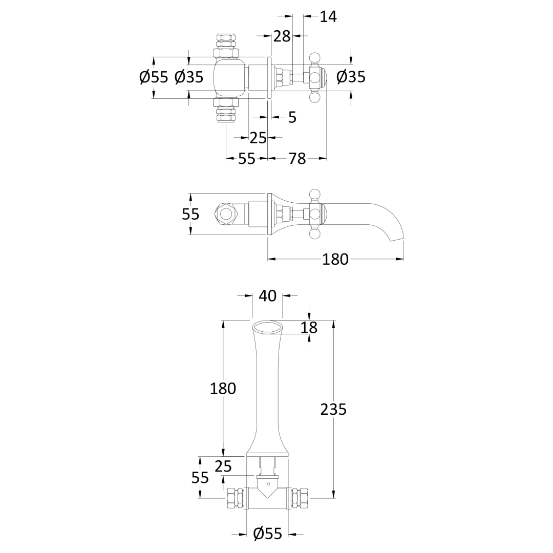 Victrion 3-Hole Wall Basin Filler With Spout Copper